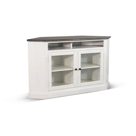 Carriage House - Corner TV Stand - White / Dark BrownVendor: Sunny DesignsThis corner TV stand was built with mahogany and mindi solids and veneers. Ideal for smaller spaces and comes with two adjustable shelves.Product Features 55 Inch Corner Stand 2 Adjustable shelves Sound Bar opening perfect for small spaces Fully Assembled Assembly Required: No 1Pc/Ass./Ctn...