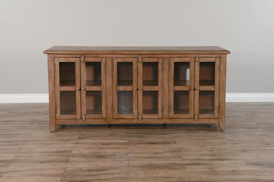 Doe Valley - 70" TV Console - Light BrownVendor: Sunny DesignsThis 70" TV console was built with rough sawn mahogany solids and veneers with glass doors and was beautifully finished.Product Features Rough sawn mahogany solids and veneers Fully assembled. Adjustable shelves Assembly Required: No 1Pc/Ass./Ctn Finish - Buckskin Doe Valley - 70" TV Console...